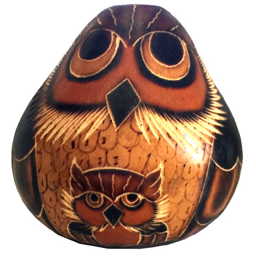 Mira a esta linda mamá búho y bebé... ¿cómo puedes mirarlos y no decir "Awww". Ella lo cuida y espera encontrar un hogar amoroso donde pueda criar a su adorable hijo. Fueron tallados a mano, dándoles vida, por un artesano en Huancayo, Perú. Cada calabaza se pela, se limpia y se seca al sol antes de grabar y quemar su superficie con los intrincados diseños que adornan su superficie. Hacen un Hoot de un adorno para sentarse en el estante, el escritorio, como decoración para el hogar o la oficina, o como regalo para los amantes de los búhos.