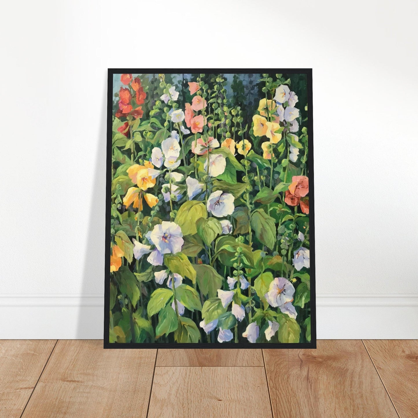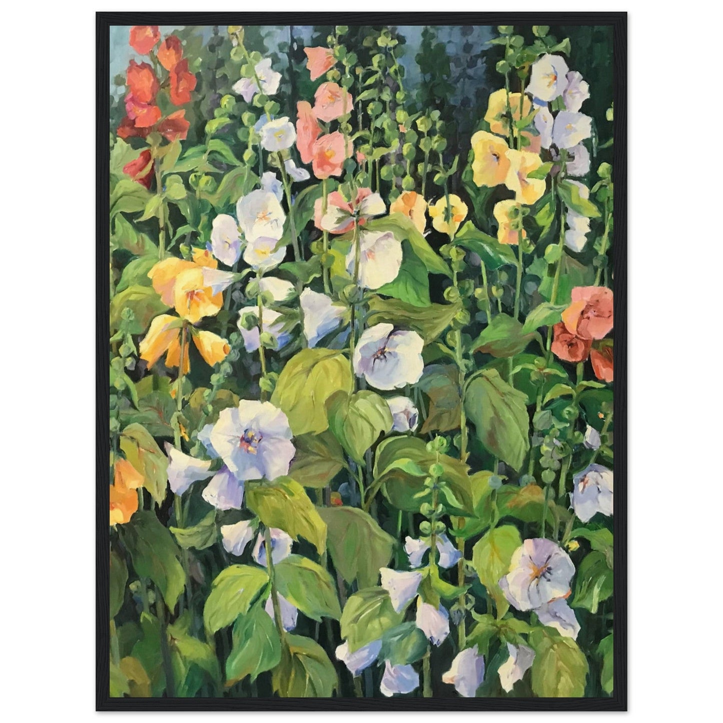 Our ready-to-hang wooden framed posters are sturdy, durable, and ready to hang instantly! This 18x24 framed print of Barbara Cleary’s floral oil painting, “Hollyhocks” is made on our master’s edition, archival museum-quality paper.