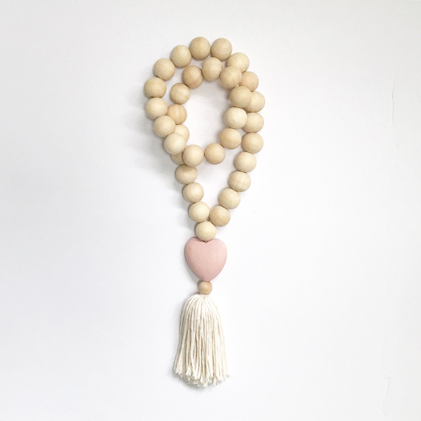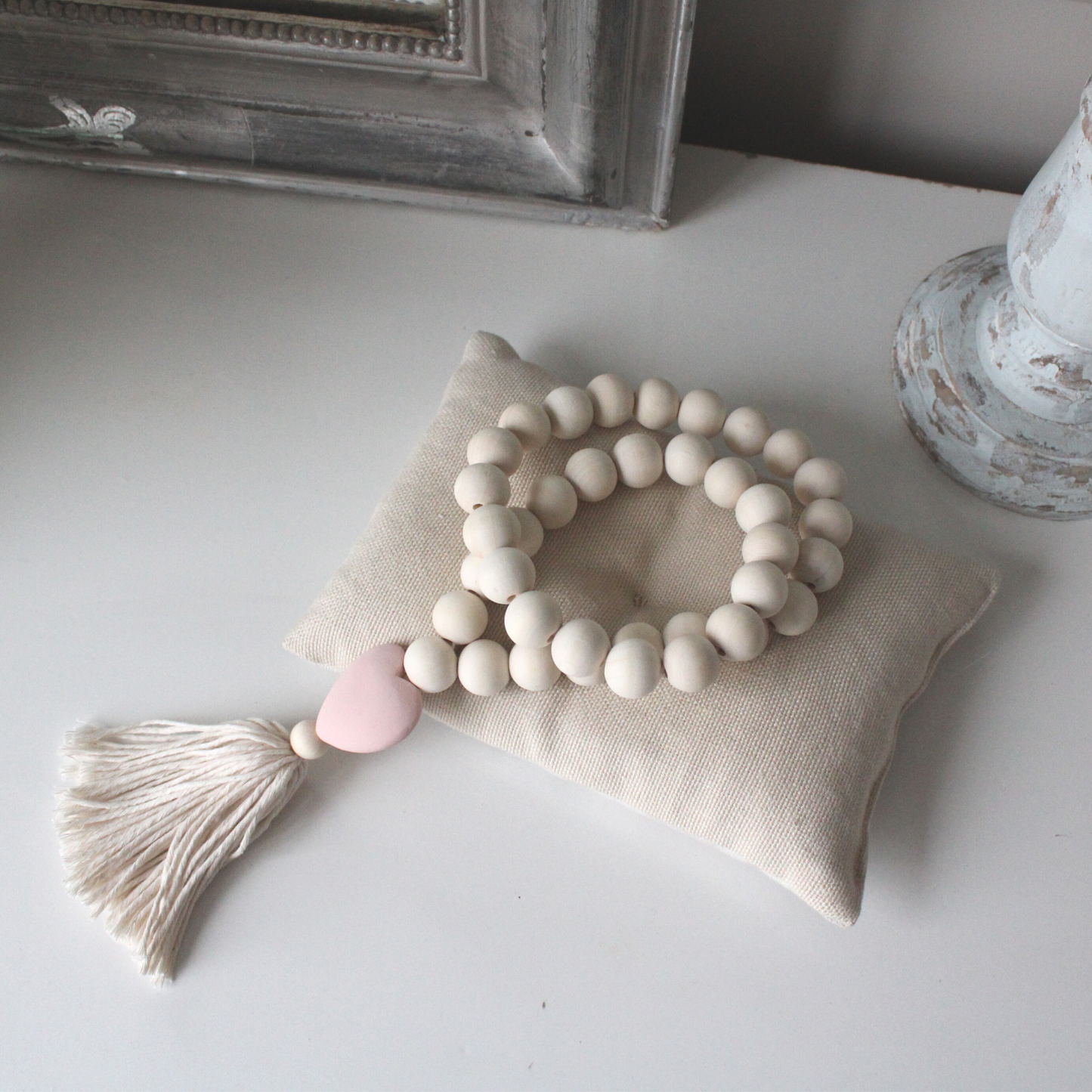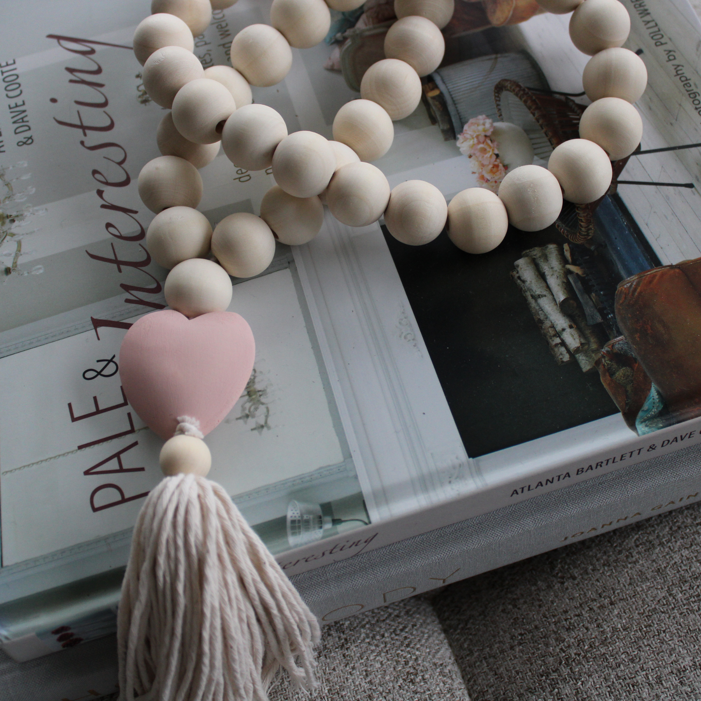 The perfect accessory for your home. These decorative beads look perfect hanging from a door handle, laying on a shelf, or adorning your coffee table with. Handmade with beautiful pine wood beads, a hand carved heart and finished with a tassel, this piece will send a daily reminder of love. Makes a great gift.