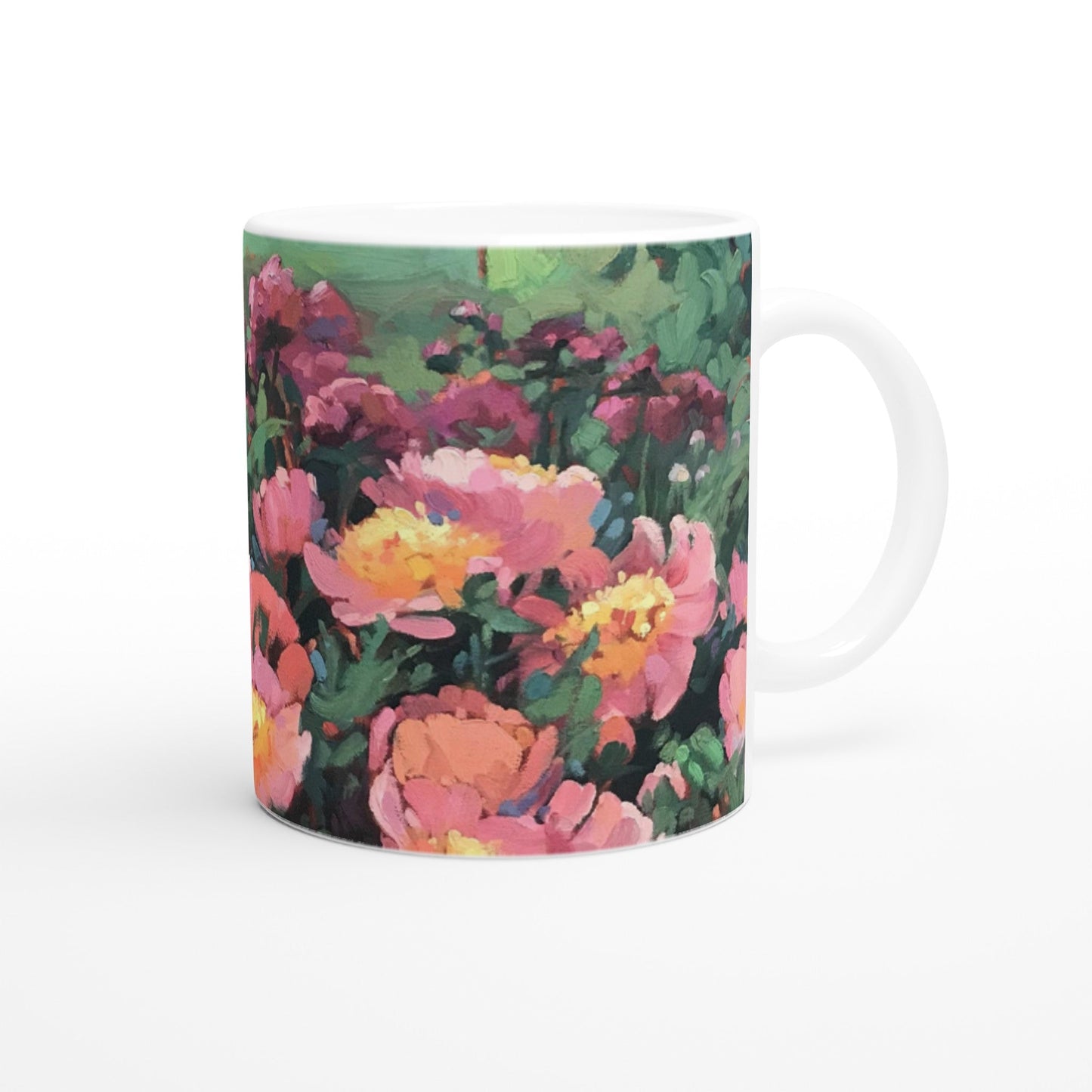 11oz White Ceramic Mug | Coffee Cup with 'Pink Princess' Floral Artwork by American Artist Barbara Cleary